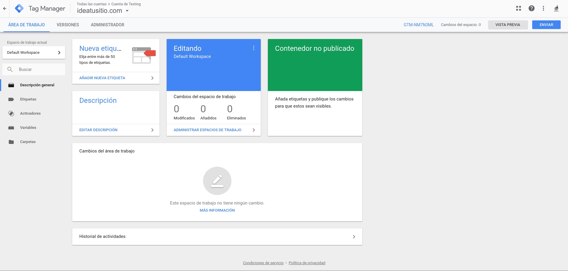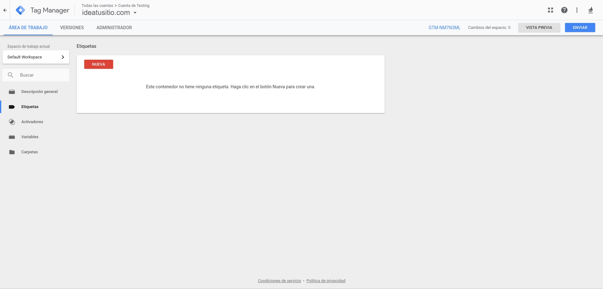 1. Lo primero que tienes que hacer es posicionarte en tu «Área de trabajo» de Google Tag Manager y obtener el ID del contenedor el cual posee este formato: GTM-XXXX. ( parte superior derecha de la pantalla)