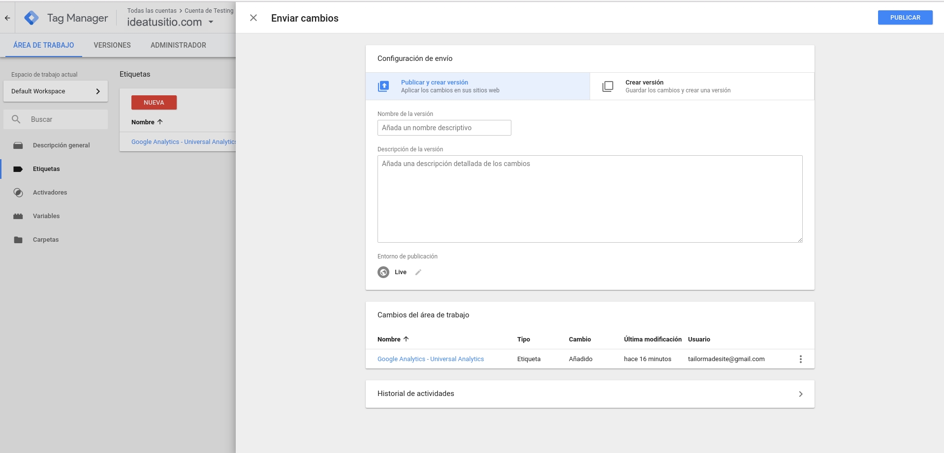 Con tu contenedor listo, haz clic en «Enviar» (esquina superior derecha) para empezar a publicar tus cambios. Escribe un “Nombre de versión” y una “Descripción de versión” para que puedas identificar tu contenedor y finalmente haz clic en “Publicar”.